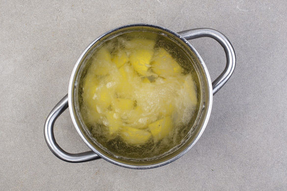 In einem mittelgroßen Topf ausreichend leicht gesalzenes Wasser für die Kartoffeln zum Kochen bringen. Die Kartoffeln schälen und je nach Größe halbieren oder vierteln. In das kochende Wasser geben und 10–15Min. kochen lassen, bis die Kartoffeln gar sind.