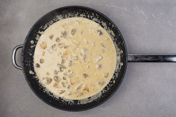 Die Crème fraîche in das Hähnchenragout einrühren und das Ragout mit Salz und Pfeffer abschmecken. Erneut etwas einkochen lassen, bis die Sauce schön cremig ist.