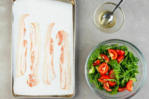 Den Bacon auf einem mit Backpapier ausgelegten Backblech verteilen und über dem Auflauf in 12–15Min. knusprig backen. Die Gurke und den Rucola mit dem Dressing vermengen. Den Auflauf mit dem Salat anrichten und mit dem Bacon garniert servieren.