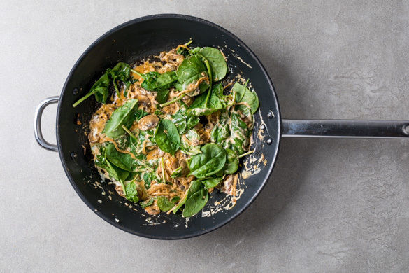 2–3TL geräuchertes Paprikapulver einrühren und das Gemüse ca. 1Min. weiterbraten. Die Sojasahne und die Sojasauce unterrühren und alles weitere 2Min. köcheln lassen. Den Spinat nach und nach dazugeben und zusammenfallen lassen. Das Pilz-Stroganoff mit Salz und Pfeffer abschmecken, nach Geschmack mehr Paprikapulver hinzufügen. Vom Herd nehmen und beiseitestellen.