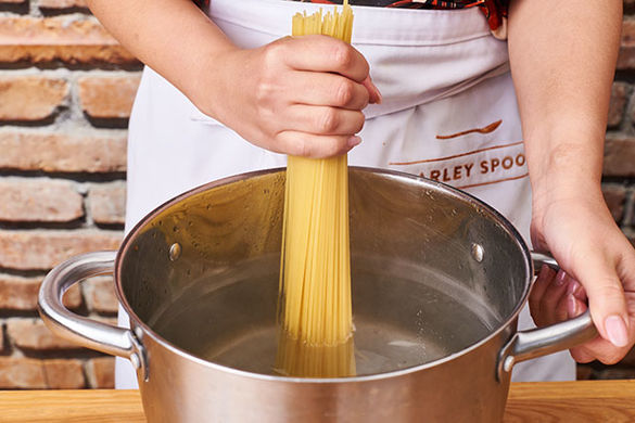Die Pasta in das kochende Wasser geben und in 7–9Min. bissfest kochen. Ca. 100ml Pastawasser abschöpfen, dann in ein Sieb abgießen und kalt abschrecken.