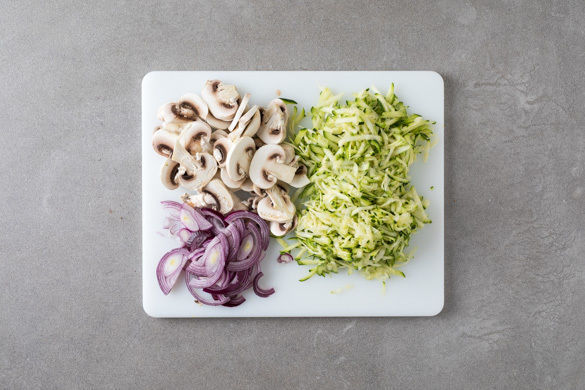 Den Backofen mit Grillfunktion auf 250°C vorheizen. Die Champignons ggf. mit etwas Küchenkrepp oder einer Bürste säubern und in dünne Scheiben schneiden. Die Zucchini mit einer Küchenreibe grob raspeln. Die Zwiebel schälen, halbieren und in dünne Streifen schneiden.