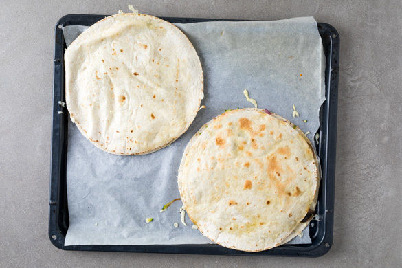 Die Quesadillas im Ofen 3–4Min. grillen, bis sie an der Oberfläche goldbraun werden. Dann mit einem Pfannenwender wenden und weitere 2–3Min. grillen, bis auch die andere Seite schön gebräunt ist. Tipp: Die Bleche einfach nacheinander in den Ofen schieben.