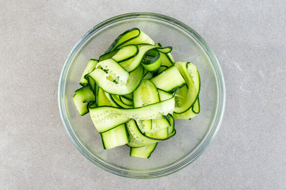 Die Gurke mit einem Sparschäler der Länge nach in breite Streifen schneiden. Mit 2EL hellem Essig, ½TL Zucker und 1 Prise Salz vermengen und beiseitestellen.