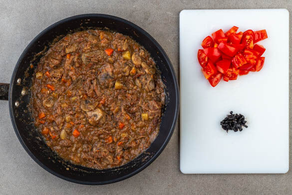 Das Bœuf bourguignon in einer großen Pfanne bei mittlerer Hitze zum Kochen bringen. Inzwischen die Tomaten grob würfeln. Den Knoblauch schälen und fein würfeln. Nachdem das Bœuf bourguignon einmal aufgekocht hat, bei niedriger Hitze warm halten. Ggf. die Konsistenz esslöffelweise mit Wasser anpassen und mit Salz und Pfeffer abschmecken.