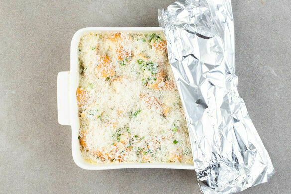 Ca. 45Min. vor dem Servieren den Backofen auf 220°C (200°C Umluft) vorheizen. Den Auflauf zunächst mit Alufolie abgedeckt im Ofen ca. 20Min. backen, dann die Alufolie entfernen und den Auflauf weitere 10–15Min. backen, bis er golden gebräunt und innen nicht mehr flüssig ist.