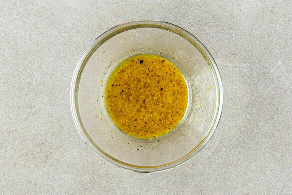 2EL körnigen Senf mit 2EL Essig, 1 kräftigen Prise Pfeffer und 1TL Salz verrühren, bis sich das Salz aufgelöst hat, dann 2EL Pflanzenöl einrühren.