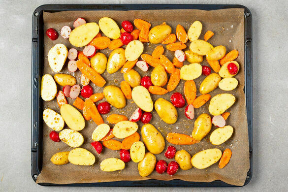 Den Backofen auf 230°C (210°C Umluft) vorheizen. Die Kartoffeln je nach Größe halbieren oder vierteln. Die Radieschen halbieren. Die Karotten ggf. schälen und schräg in Scheiben schneiden.