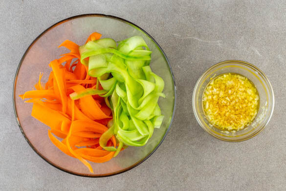 2EL Butter beiseitestellen und weich werden lassen. Die Karotten schälen und mit dem Sparschäler der Länge nach in dünne Streifen schneiden. Die Gurke schälen und bis zum Kerngehäuse ebenfalls mit dem Sparschäler der Länge nach in dünne Streifen schneiden.