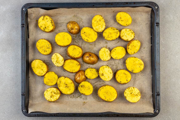Den Backofen auf 240°C (220°C Umluft) vorheizen. Die Kartoffeln in ca. 2cm dicke, runde Scheiben schneiden, dann mit 4EL Olivenöl, der Knoblauch-Kräuter-Gewürzmischung, 2TL Salz und 1 kräftigen Prise Pfeffer vermengen. Die Kartoffeln auf ein mit Backpapier ausgelegtes Backblech geben und ca. 20Min. im Ofen backen. Danach durchmischen und ca. 10Min. weiterbacken.