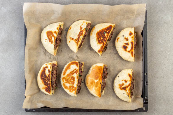 Eine große Pfanne ohne Zugabe von Fett bei niedriger bis mittlerer Hitze erwärmen, dann die Pitas portionsweise auf jeder Seite in 1–2Min. goldbraun anbraten. Die Pitas auf ein zweites mit Backpapier ausgelegtes Blech geben und ca. 10Min. im Ofen backen, bis das Fleisch durch ist.