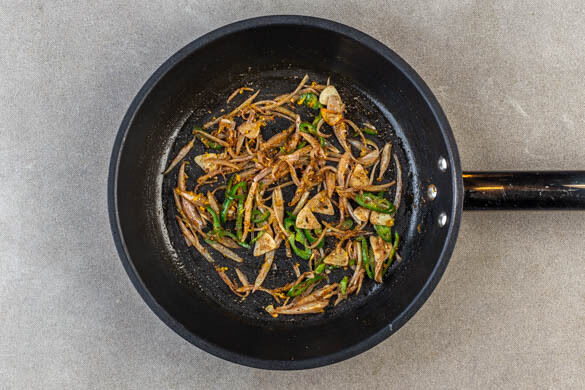 Den Knoblauch, die Schalotten und die ½ der Peperoni in einer großen Pfanne mit 2EL Olivenöl bei niedriger bis mittlerer Hitze in ca. 2Min. glasig anbraten, dabei ab und an umrühren. Dann die Zitronenschale und die Gewürzmischung hinzugeben und weitere ca. 2Min. braten, bis die Gewürze aromatisch duften.