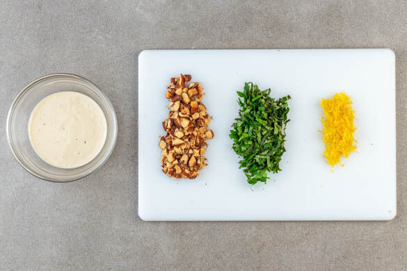 Die Minzeblätter von den Stängeln zupfen und mit der Petersilie fein schneiden. Die Mandeln grob hacken. Die Zitrone halbieren. Die Zitronenschale von einer Hälfte abreiben, dann die Zitronenhälfte auspressen. Das Tahini mit 2EL Zitronensaft, ½–1EL Wasser und 1EL Olivenöl zu einer glatten Sauce verrühren. Mit Salz und Pfeffer abschmecken.