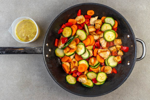 Den Gemüsemix in die Pfanne geben und ca. 5Min. mitbraten. Währenddessen das Brühgewürz in 200ml warmem Wasser auflösen.