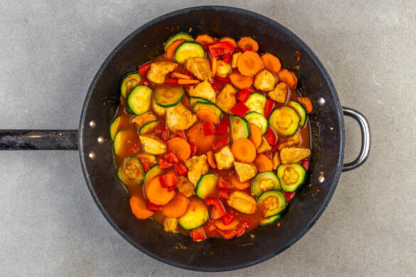 Die Harissa unterrühren, dann langsam die Brühe angießen. Mit 1 Prise Salz und 1TL Zucker würzen und bei mittlerer Hitze ca. 8Min. köcheln lassen. Mit ggf. mehr Salz und Zucker abschmecken.