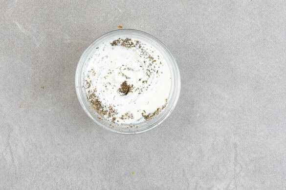 Den Knoblauch nach ca. 10Min. aus dem Ofen nehmen, vorsichtig schälen und mit einer Gabel zerdrücken. Den Joghurt mit dem Knoblauch, 1 kräftigen Prise getrockneter Minze und 1TL Essig verrühren. Den Minzjoghurt ggf. mit mehr Minze, Salz und Pfeffer abschmecken.