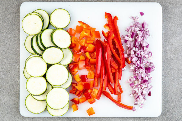 Den Backofen auf 240°C (220°C Umluft) vorheizen. In einem mittelgroßen Topf 600ml leicht gesalzenes Wasser zum Kochen bringen. Die Zucchini in ca. 1cm dünne Scheiben schneiden. Die Paprika vierteln und entkernen, dann eine Paprika in ca. 2cm große Würfel, die andere Paprika in dünne Streifen schneiden. Die Zwiebel schälen, halbieren und fein würfeln.