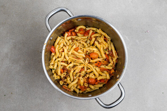 Die Pasta in das kochende Wasser geben und in 7–9Min. bissfest kochen. Mit einer Tasse etwas Pastawasser abschöpfen, dann in ein Sieb abgießen. Die abgetropfte Pasta zurück in den Topf geben und ggf. mit 1TL Olivenöl vermengen.
