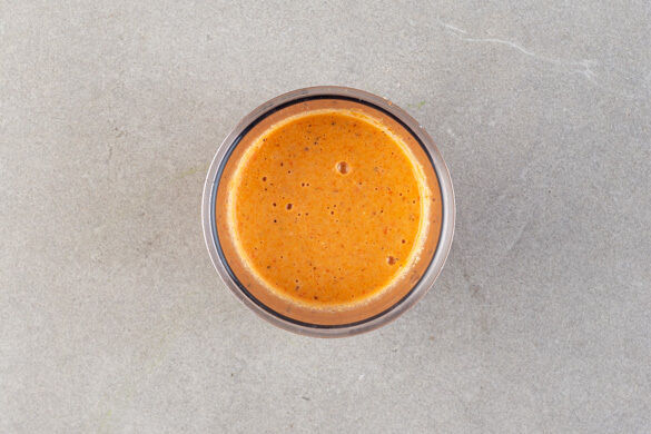 Die Cashews und die Paprika mit 1EL Essig, den Hefeflocken, der ½ des Brühgewürzes oder mehr nach Geschmack, ½TL Paprikapulver und 1 Prise Pfeffer mit einem Stabmixer cremig pürieren. Mit Salz abschmecken.