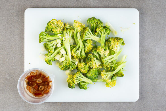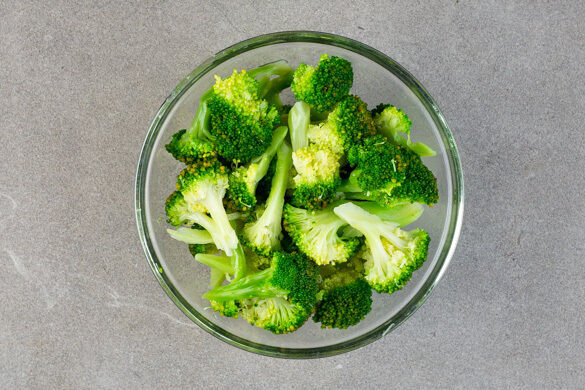 Den Brokkoli in das kochende Wasser geben und bei mittlerer Hitze in 5–6Min. gar kochen. In ein Sieb abgießen, mit kaltem Wasser abschrecken und abtropfen lassen.