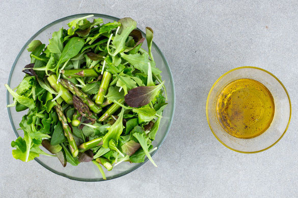Den Salat und den restlichen Spargel kurz vor dem Servieren mit dem Dressing vermengen. Die Flammkuchen nach Belieben in Stücke schneiden und mit dem Salat servieren.