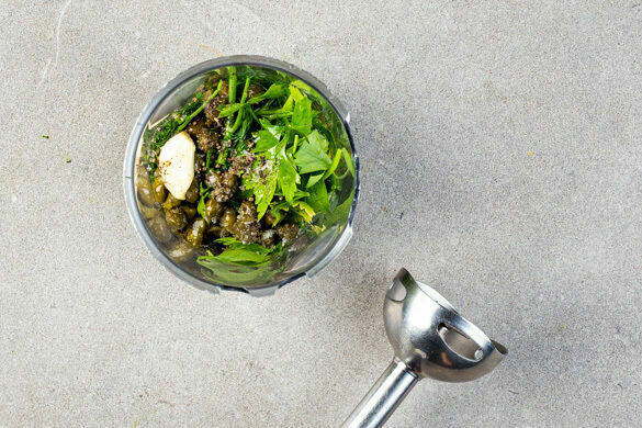 Die Minze, den geschnittenen Dill und die Petersilie mit der ½ der Kapern, der ½ des Knoblauchs oder mehr nach Geschmack, 4EL Mayonnaise, 4EL Olivenöl, 4EL Essig, 3–4EL Wasser, ½TL Salz und 1 kräftigen Prise Pfeffer in einem hohen Gefäß mit einem Stabmixer cremig pürieren.