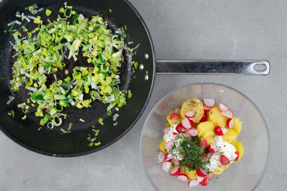 Den Lauch in einer großen Pfanne mit 2EL Olivenöl bei starker Hitze ca. 2Min. scharf anbraten. Die Kartoffeln pellen, in dünne Scheiben schneiden und vorsichtig mit der Mayonnaisecreme vermengen. Mit Essig, Salz und Pfeffer abschmecken, dann die Radieschen, den Lauch und den Dill unterheben. Den Salat nach Belieben mit Salz und Pfeffer verfeinern.