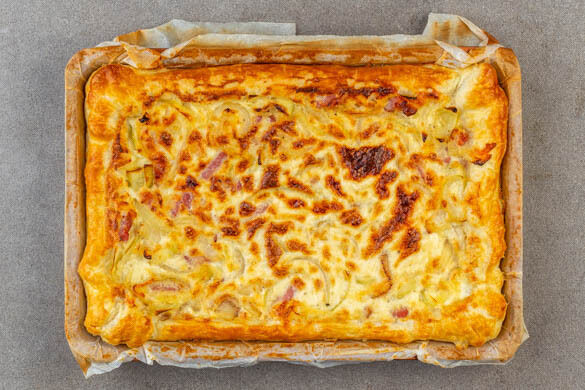 Den Teig vorsichtig ausrollen und mit den Fingern leicht auseinanderziehen oder mit einem Nudelholz etwas ausdünnen. Mit dem Backpapier nach unten in eine ca. 28x20cm große Auflaufform oder eine Tarteform legen und einen Rand formen. Der Rand der Backform sollte nicht höher als 4cm sein. Den Teigboden gleichmäßig mit einer Gabel lochen, dann die Füllung auf dem Teig verteilen.