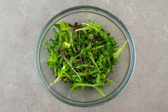 1EL Olivenöl, 1EL Essig und ½EL Wasser verrühren und das Dressing mit Salz und Pfeffer abschmecken. Den Schnittlauch in kleine Röllchen schneiden. Den Salat und die ½ des Schnittlauchs kurz vor dem Servieren mit dem Dressing vermengen. Die Quiche mit dem restlichen Schnittlauch garnieren und mit dem Salat servieren.