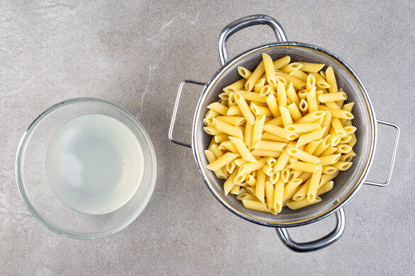 Die Pasta in das kochende Wasser geben und in 8–10Min. bissfest kochen. Ca. 100ml Pastawasser abschöpfen, dann die Pasta in ein Sieb abgießen, abtropfen lassen und zurück in den Topf geben.