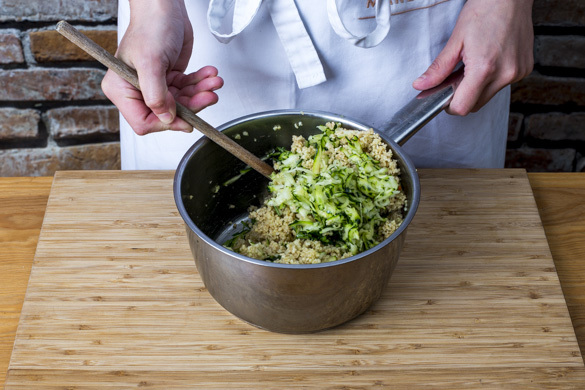 Den Backofen auf 200°C (180°C Umluft) vorheizen. In einem kleinen Topf 300ml Wasser zum Kochen bringen. Den Bulgur mit der ½ des Brühgewürzes in das kochende Wasser rühren und abgedeckt bei niedriger Hitze 5–7Min. sanft köcheln lassen, bis das Wasser aufgesaugt und der Bulgur gar ist. Noch ca. 5Min. ohne Hitzezufuhr ziehen lassen.