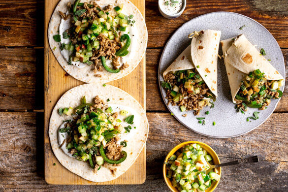 Schnell, schneller, am schnellsten! Heute geht das Kochen in Windeseile – und doch zauberst du eine Vielfalt an Aromen und Texturen auf den Tisch. In den soften Wraps bettest du herzhaftes Schweinehack und gebratene Paprika auf cremigem Joghurt, der knackig-würzige Apfel-Gemüse-Mix obendrauf wird deine Sinne betören. Los geht’s!