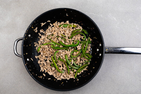 Die Paprika vierteln, entkernen und in dünne Streifen schneiden, dann in einer großen Pfanne mit 1EL Olivenöl, ½ der Gewürzmischung und 1 Prise Salz bei mittlerer Hitze 2–3Min. anbraten. Tipp: Wer mag, kann auch mehr Gewürzmischung verwenden.
