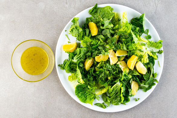 Aus 2EL Pflanzenöl, 2EL Essig und 1 kräftigen Prise Salz ein Dressing anrühren und mit dem Salat und den Orangen vermengen. Den Salat mit den Kräutern garnieren und mit dem Dip zu den Bratlingen servieren.