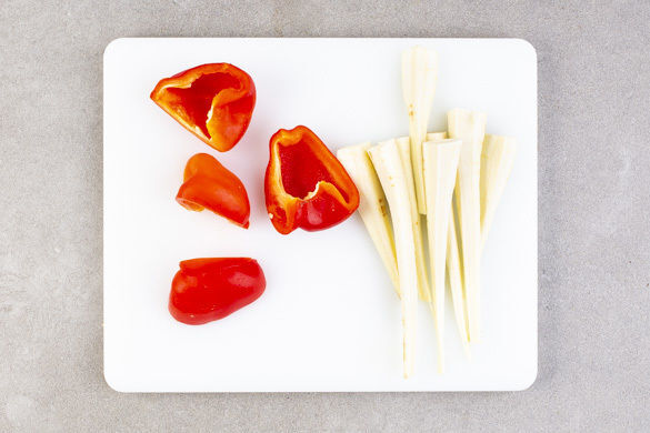 Den Backofen auf 240°C (220°C Umluft) vorheizen. Die Paprika vierteln und entkernen. Die Pastinaken schälen und der Länge nach vierteln.