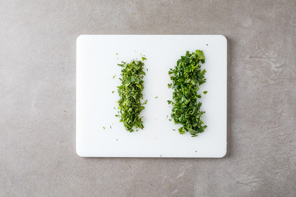 Die Minzeblätter von den Stängeln zupfen und fein schneiden. Die Petersilie samt Stängeln fein hacken. Die Kräuter und den Orangensaft unter den Salat mischen. Die Paprika in kleine Würfel schneiden. Den Salat mit dem Ofengemüse, den Paprikawürfeln und den Orangenfilets anrichten und servieren.