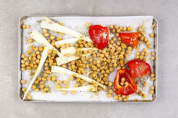 Die Kichererbsen in ein Sieb abgießen. Den Knoblauch schälen und fein würfeln. Die Paprika, die Pastinaken, die Kichererbsen und den Knoblauch auf einem mit Backpapier ausgelegten Backblech mit 1EL Olivenöl, der ½ der Gewürzmischung sowie Salz und Pfeffer vermengen und 20–30Min. im Ofen rösten, bis das Gemüse knusprig und an den Rändern leicht gebräunt ist.