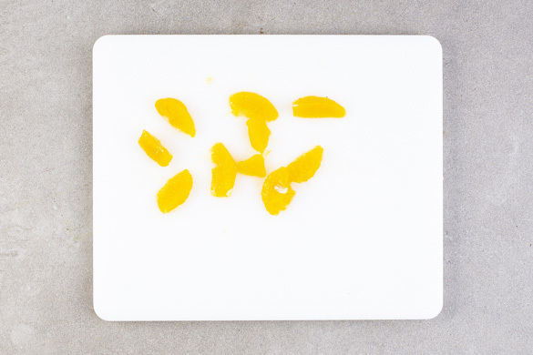 Die Orange filetieren. Dafür die Orangenschale so herunterschneiden, dass die weiße Haut vollständig vom Fruchtfleisch entfernt wird. Dann die Filets vorsichtig aus den weißen Zwischenräumen schneiden. Den restlichen Saft auspressen. Tipp: Wer mag, kann die Orange auch einfach schälen und in Spalten schneiden.
