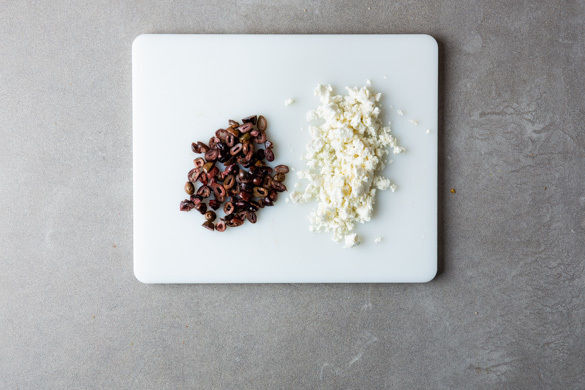 Den Feta mit den Fingern oder einer Gabel zerkrümeln. Die Oliven in dünne Ringe schneiden.