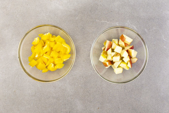 Die Paprika vierteln, entkernen und in ca. 1cm kleine Stücke schneiden. Die Äpfel ebenfalls vierteln, vom Kerngehäuse befreien und in ca. 1cm kleine Stücke schneiden.