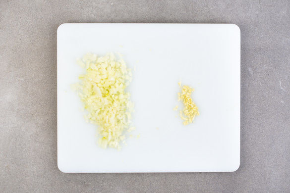 Den Backofen auf 200°C (180°C Umluft) vorheizen. Die Zwiebeln schälen und in feine Würfel schneiden. Den Knoblauch schälen und ebenfalls fein würfeln.