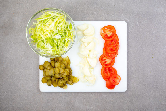 Die Tomaten in dünne Scheiben schneiden. Die Zwiebeln schälen, halbieren und in feine Streifen schneiden. Den Eisbergsalat halbieren und die Hälften in dünne Streifen schneiden. Die Gewürzgurken in dünne Scheibchen schneiden, das Gurkenwasser aufbewahren!