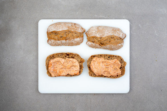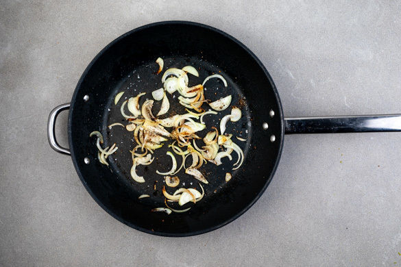 Die Zwiebeln in derselben Pfanne mit 1EL Pflanzenöl bei mittlerer Hitze 3–4 Min. anbraten und leicht mit Salz und Pfeffer würzen. Die Brötchen 3–5Min. im Ofen aufknuspern.