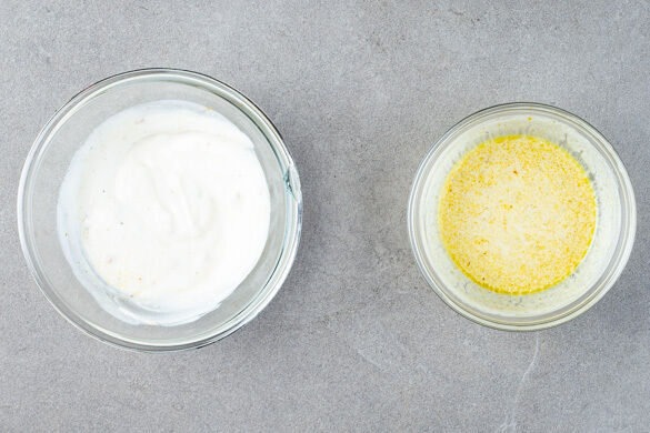 Die ½ des Chutneys mit dem Joghurt sowie je 1 Prise Salz und Pfeffer verrühren. Anschließend 2EL des Mangojoghurts abnehmen und mit 1 Prise Currypulver, 2EL Olivenöl und 1EL Wasser zu einem Dressing vermengen. Mit Salz und Pfeffer abschmecken.