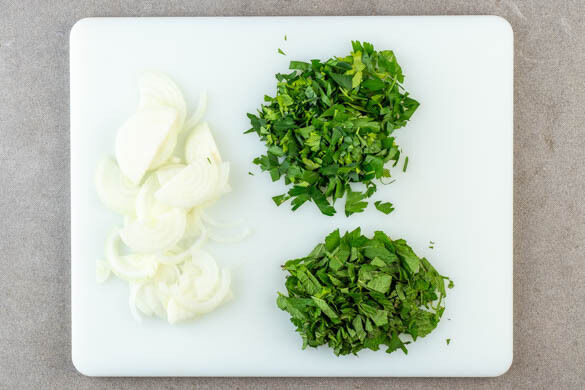 In einem Wasserkocher 300ml leicht gesalzenes Wasser zum Kochen bringen. Den Reis in einem Sieb kalt abspülen, bis das Wasser klar bleibt. Die Zwiebel schälen, halbieren und in feine Streifen schneiden. Die Petersilie samt Stängeln fein hacken. Die Minzeblätter von den Stängeln zupfen und fein schneiden.