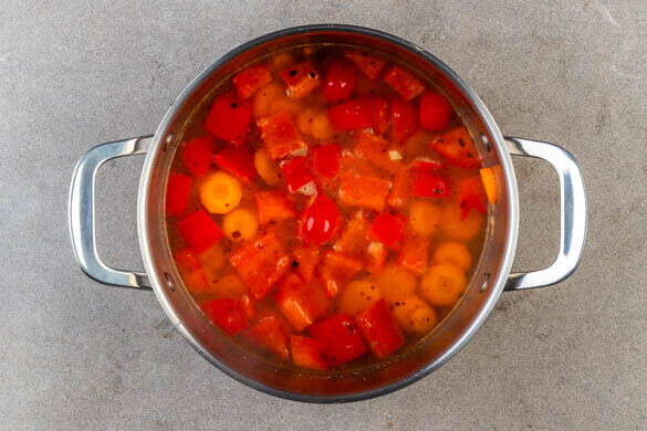 In einem mittelgroßen Topf 2EL Pflanzenöl bei mittlerer Hitze erwärmen. Die Karotten und die Paprika in den Topf geben und ca. 3Min. braten. Den Knoblauch zugeben und ca. 1Min. mitbraten. Dann die Chiliflocken, 1½EL Honig, 300ml Wasser, den Zitronensaft, ½TL Salz und 1 Prise Pfeffer unterrühren.