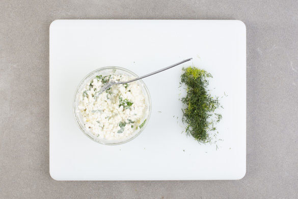 Den Dill samt Stängeln fein schneiden und die ½ des Dills unter den Joghurt rühren. Den Dip mit 1EL Olivenöl, 1EL Essig sowie Salz und Pfeffer nach Geschmack verfeinern.