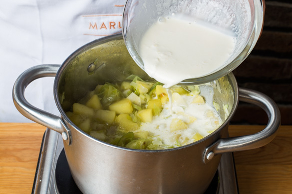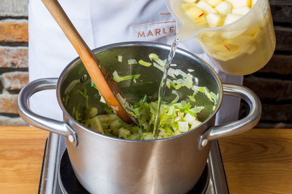 Den Sellerie und die Zwiebeln in einem großen Topf mit 2EL Pflanzenöl bei geringer Hitze in 2–3Min. farblos anschwitzen. Mit der Apfel-Brühe ablöschen, die Temperatur erhöhen und alles ca. 20Min. kochen, bis der Sellerie weich ist.
