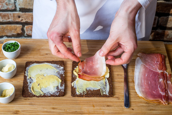 Inzwischen die Brötchen auf einem mit Backpapier ausgelegten Backblech 4–5Min. im Ofen aufbacken. Anschließend kurz abkühlen lassen, dann aufschneiden und die Schnittflächen mit je ½TL Butter und je ½EL Senf bestreichen. Mit dem Schinken belegen und mit Schnittlauch garnieren.