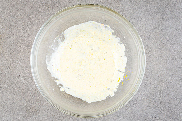 Den Backofen auf 220°C (200°C Umluft) vorheizen. Das Fleisch aus dem Kühlschrank nehmen und Raumtemperatur annehmen lassen. Die Zitronenschale abreiben, dann die Zitrone halbieren und auspressen. Die Zitronenschale mit 2EL Mayonnaise, 1EL Essig sowie je 1 Prise Salz und Pfeffer verrühren.